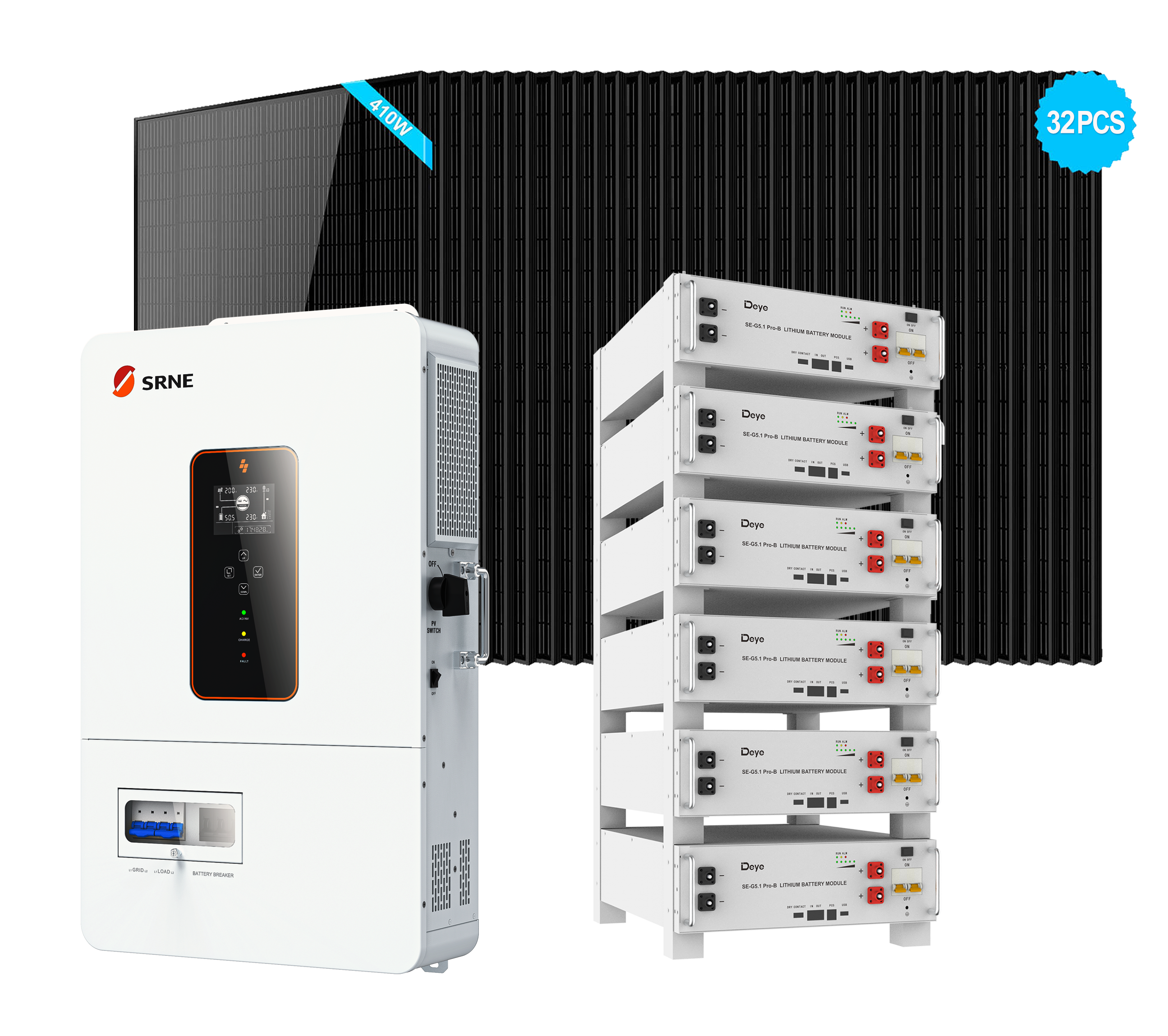 Off-Grid Solar Kits With SRNE 10kW Off-Grid Inverter + 6PCS Deye SE-G5.1 Pro-B 5.12kWh LFP Rack-Mounted Battery + 32PCS 410W Solar Panels