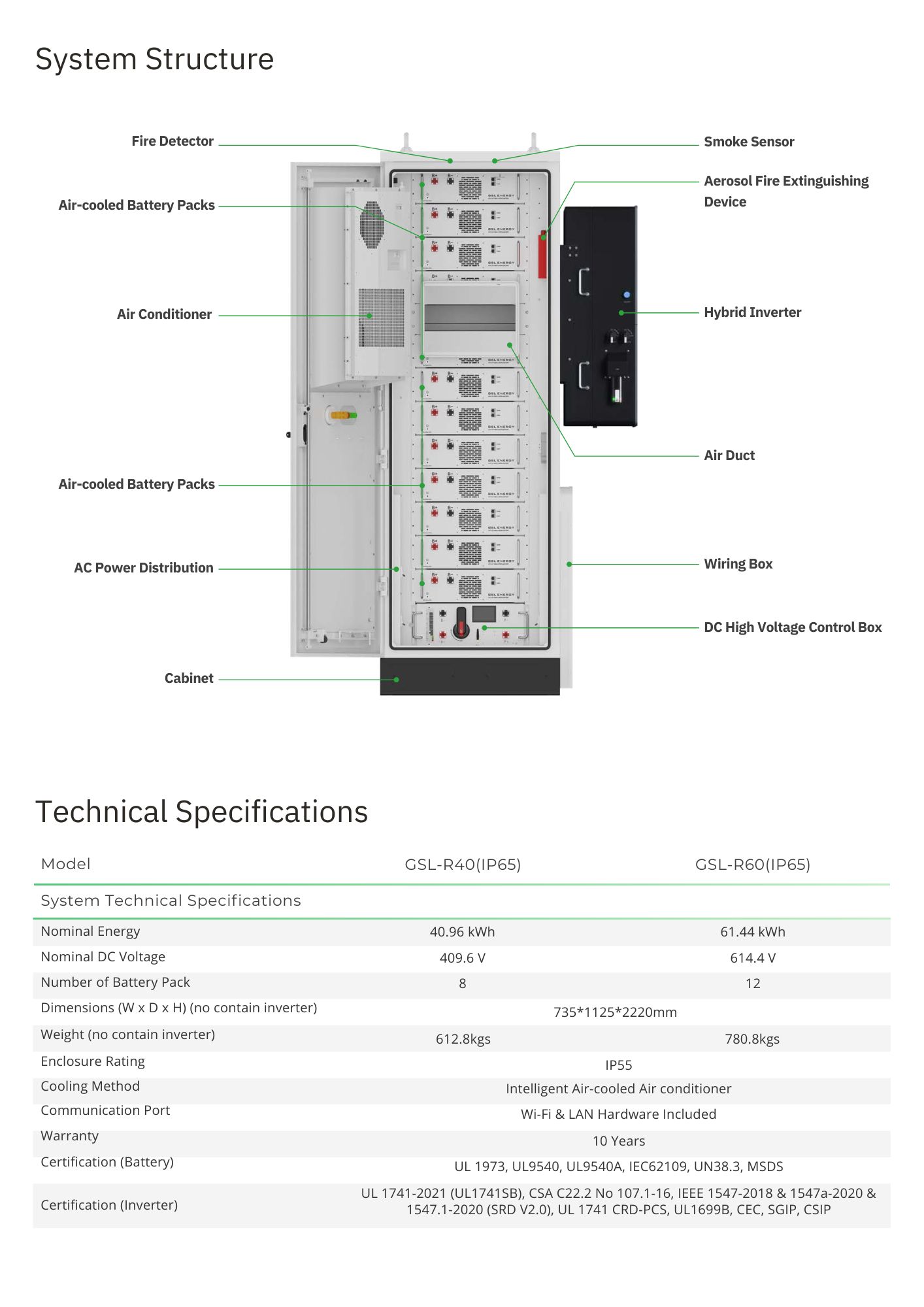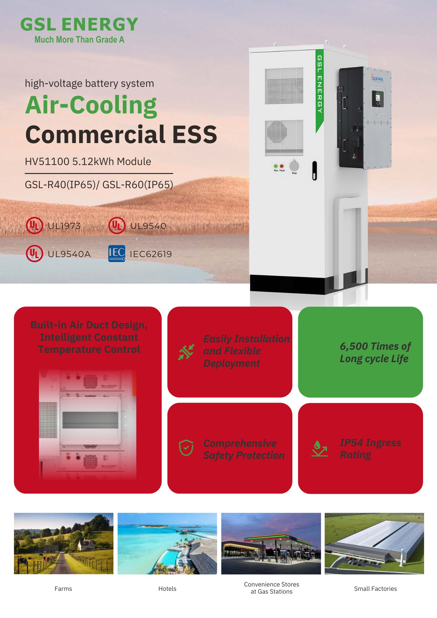 • Global Safety Certifications: UL1973, UL9540, UL9540A, IEC62619, IEC62109, UN38.3, MSDS.