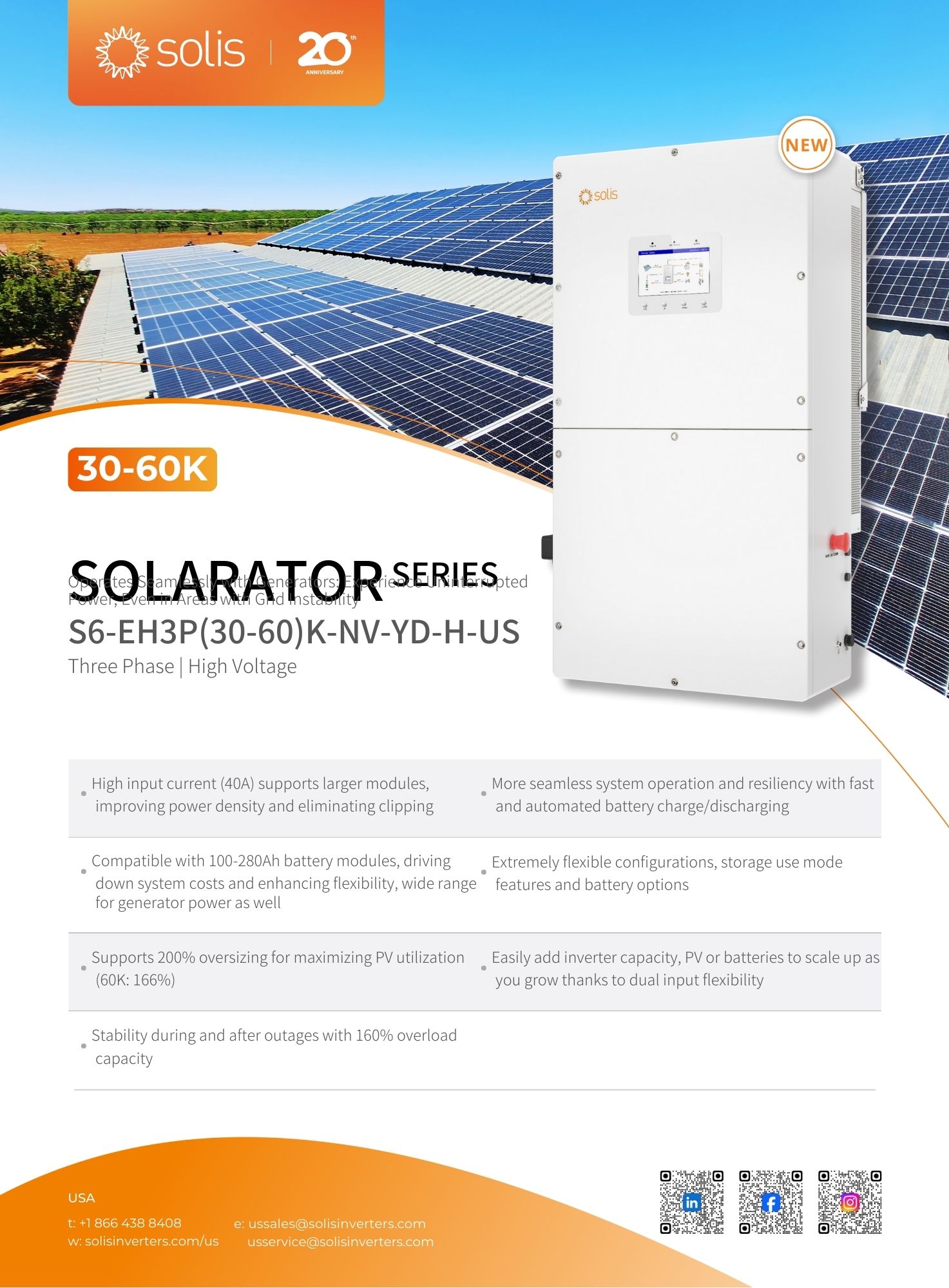 Introducing the Solis Commercial Hybrid Series. High voltage, three-phase energy storage for commercial applications. The inverter series, which boasts a maximum charge/discharge current of 70A+70A across two independently controlled battery ports, enabling optimum flexibility and scalability for commercial projects today and tomorrow. Whether for on or off-grid applications, the Commercial Hybrid series supports more flexible and scalable solar+storage with key features as well as an open ecosystem of today’s leading battery suppliers.